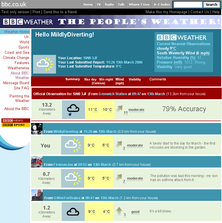 - The user gets the satisfaction of seeing their BBC weather with 'This is probably only 79% right...' next to their forecast, and knowing that they corrected the BBC.